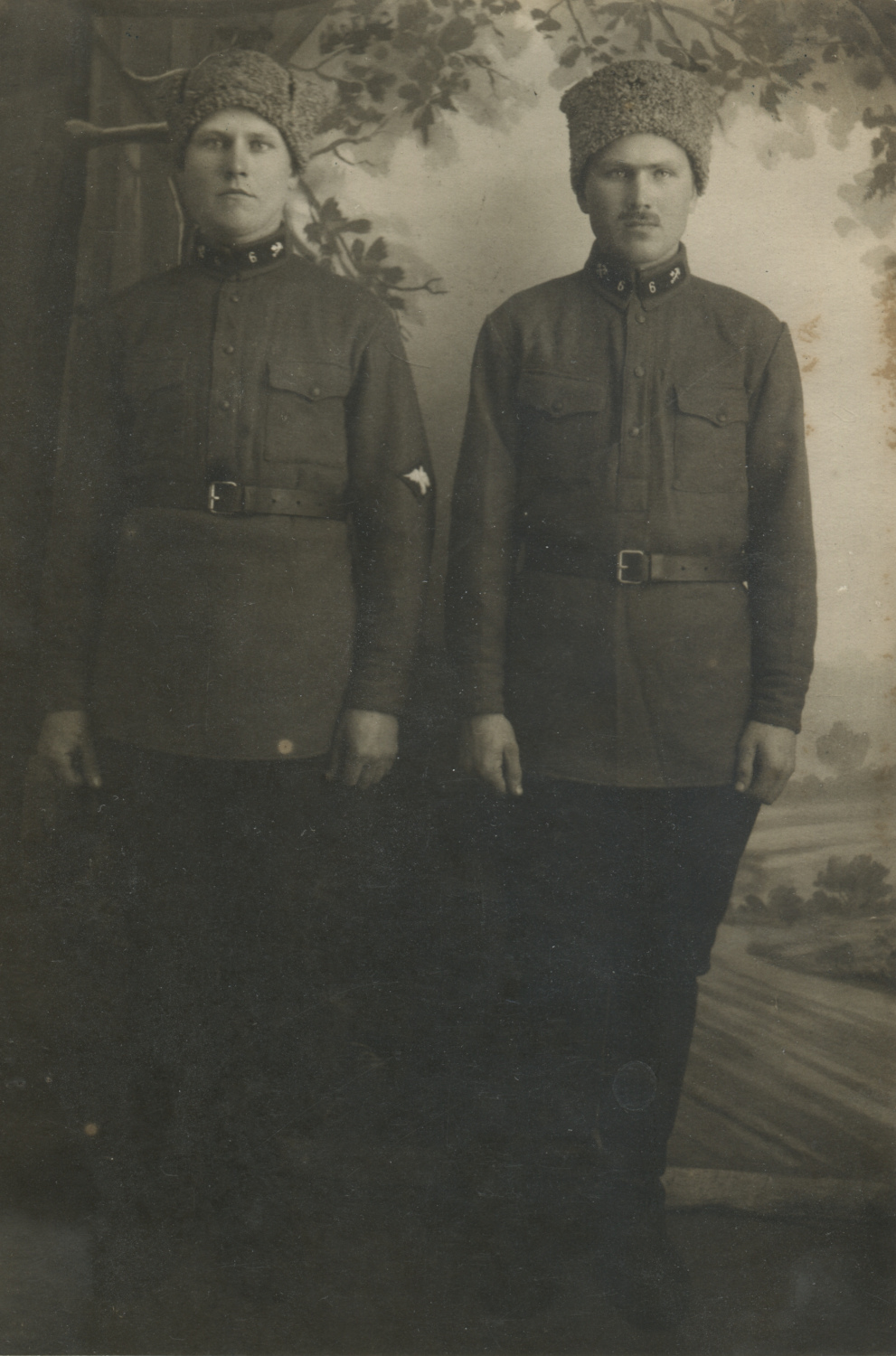 Красноармейцы 6-го железнодорожного полка К.Е. Кононюк и Ф. Гущин с петличной шифровкой «6». Цифры и значки рода войск выполнены из металла. Киев, январь 1930 г. Коллекция автора