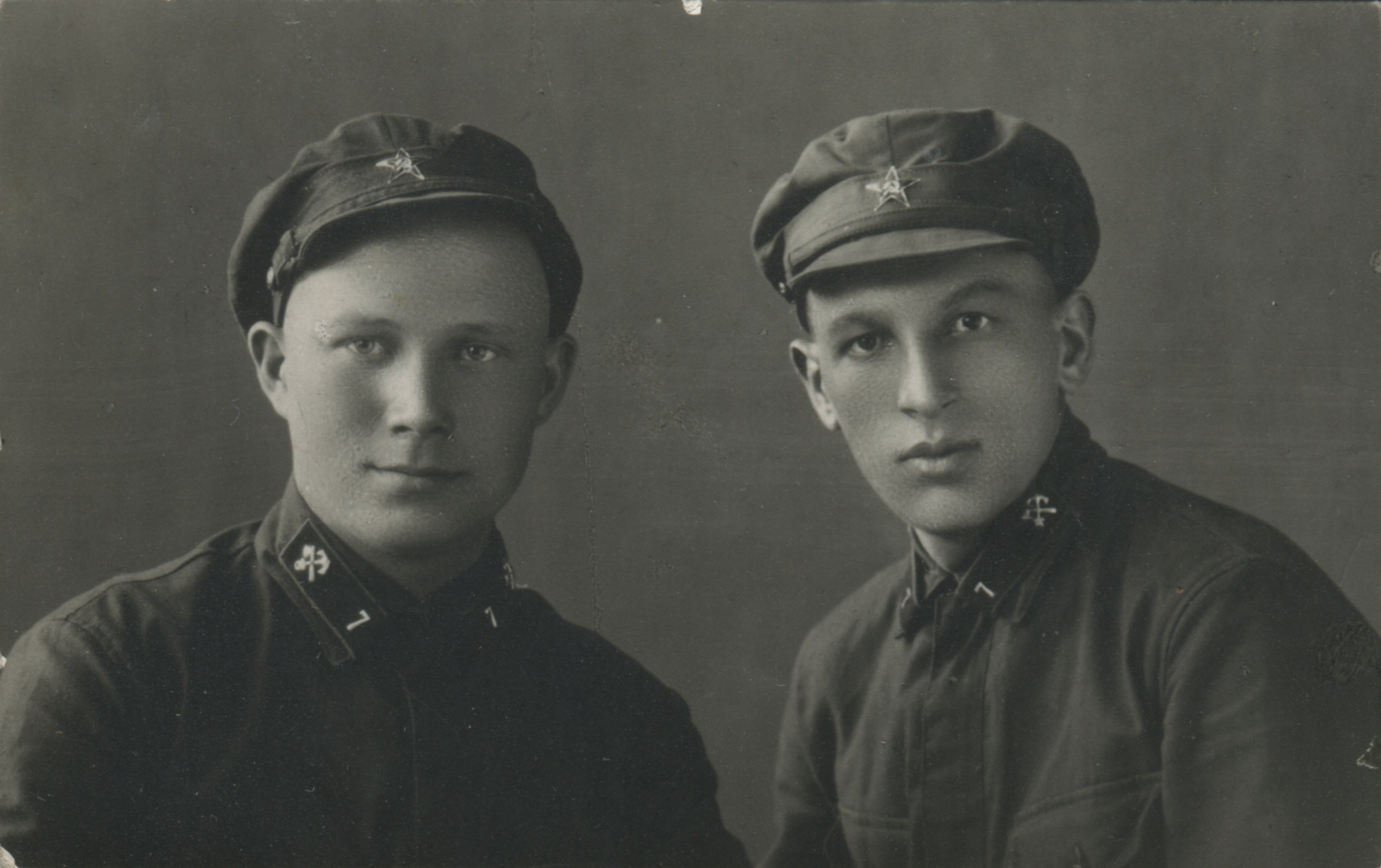Место съемки этих двух красноармейцев надежно связывается с дислокацией 7-го железнодорожного полка. На петлицах шифровка «7», значки и цифры - съемные металлические. Козлов, б/д. Коллекция автора