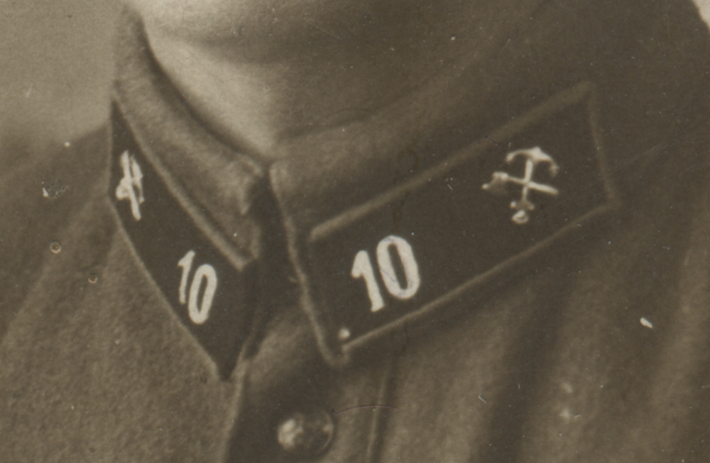 Шифровка с номером полка («10») у этого неизвестного красноармейца красочная, а значок железнодорожных войск - металлический. Коллекция автора