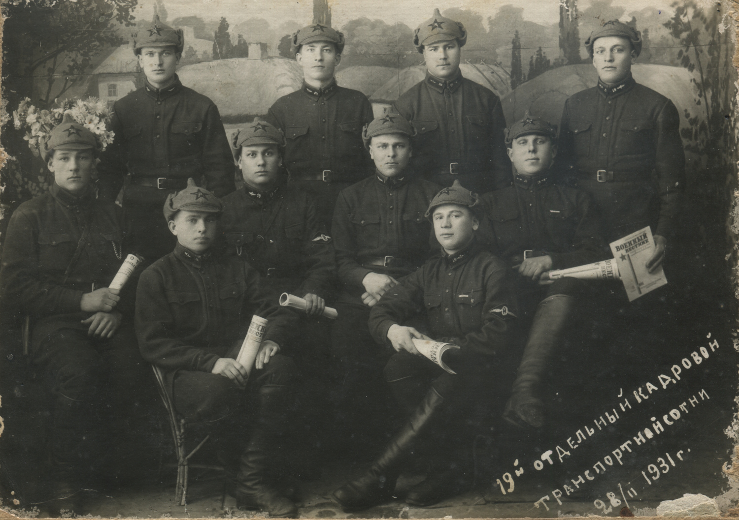 Красноармейцы 19-й отдельной транспортной роты («сотни» [23]) УВО. На петлицах присутствует шифровка «19» со значками ВОСО № 10, в т. ч. вариант значка со звездой. Шифровки как выполненные краской, так и металлические. У двоих изображенных нашиты нарукавные знаки ВОСО. Чернигов, 28 февраля 1931 г. Коллекция автора