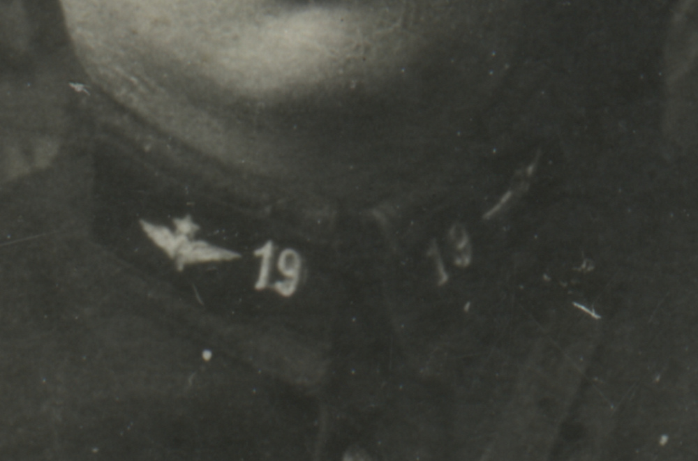 Неизвестный военнослужащий ВОСО Отдельной Кавказской армии (Кавказской Краснознаменной армии) в форме одежды образца 1922 г. со значками № 19 на петлицах (согласно приказу РВСР № 322 от 31 января 1922 г.). Фрагмент групповой фотографии. Коллекция автора