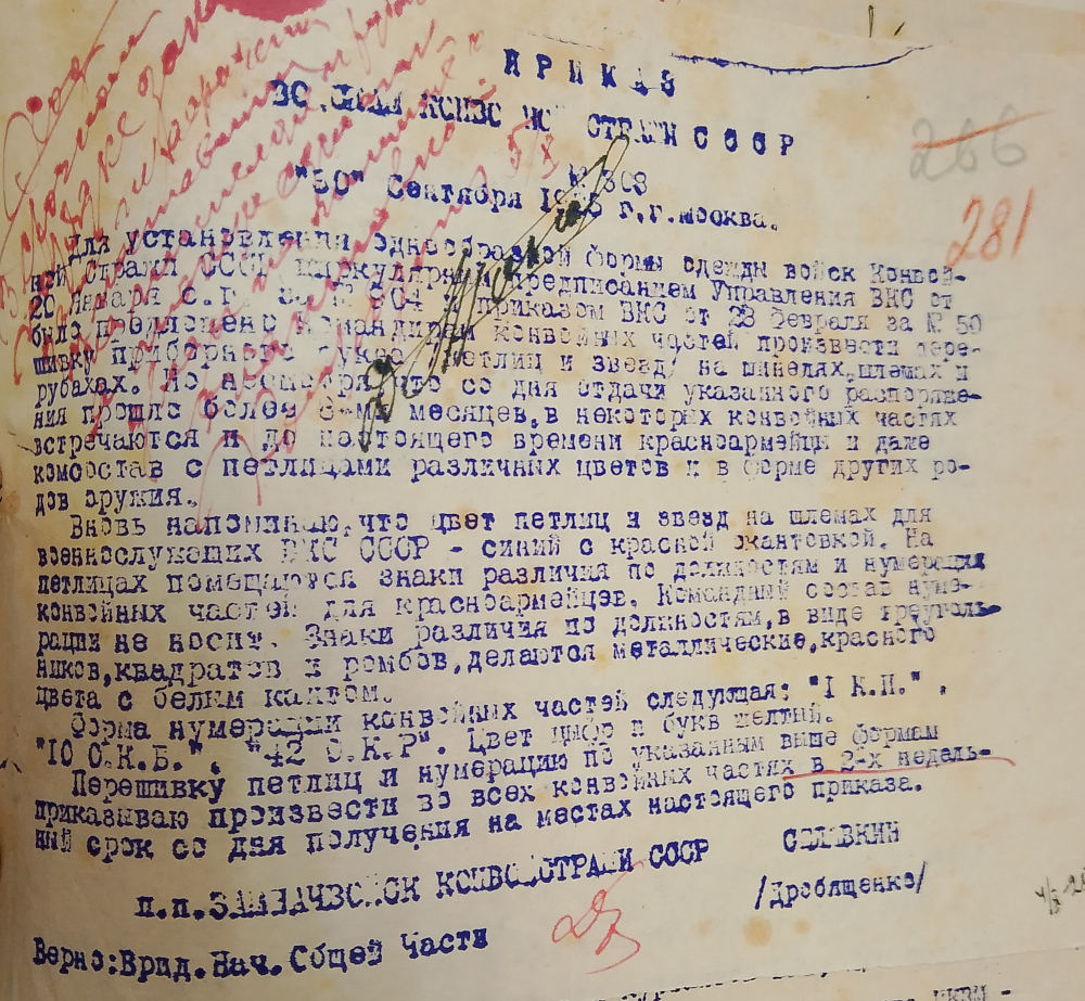 Мы, разумеется, не собираемся отрицать тот факт, что «конспекты», касающиеся конвойной стражи, составленные Р.Г. Калюжным в ходе исследования фондов РГВА у нас имелись. Однако, ни одной строчки из них мы не использовали в работе в силу ряда причин. Во-первых, в этом не было никакой необходимости, так как имевшегося фактографического материала для наших задач более чем хватало, причем большую часть даже не удалось использовать (например, все переформирования конвойных батальонов, рот и взводов в период 1924-1935 гг.), чтобы не загромождать статью. Во-вторых, к сожалению, качество составления им «конспектов» не позволяет использовать эти документы в работе в принципе, даже возникни такое желание, так как они полны ошибок. Например, как можно использовать «конспект» приказа ВКС № 308 от 1925 г., в котором, согласно Р.Г. Калюжному, написано, что отступ петлицы от края воротника составляет 13 сантиметров? Если его составитель столь вольно обращается с этими цифрами, где гарантия, что он точен во всем остальном?