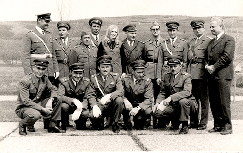 Работники милиции СФРЮ в кителях со знаками различия образца 1967 г. На погонах присутствуют факелы в качестве составного элемента знаков различия. У некоторых на груди эмблемы дорожной милиции в виде расправленных крыльев, соединенных колесом с красной звездой. Стоит третий слева в пилотке-«титовке» военнослужащий ЮНА с армейскими эмблемами на воротнике кителя. Б/м, б/д. Частая коллекция