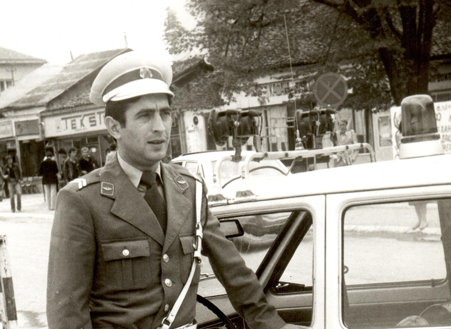 Шинель работника милиции в звании «stariji inspector» с эмблемами дорожной милиции на основах (петлицах) из материала шинели. Окантовка на шинели работников милиции СР Сербии появилась в 1982 году (согласно положению от 10 февраля 1982 г.). Источник: https://www.kupindo.com