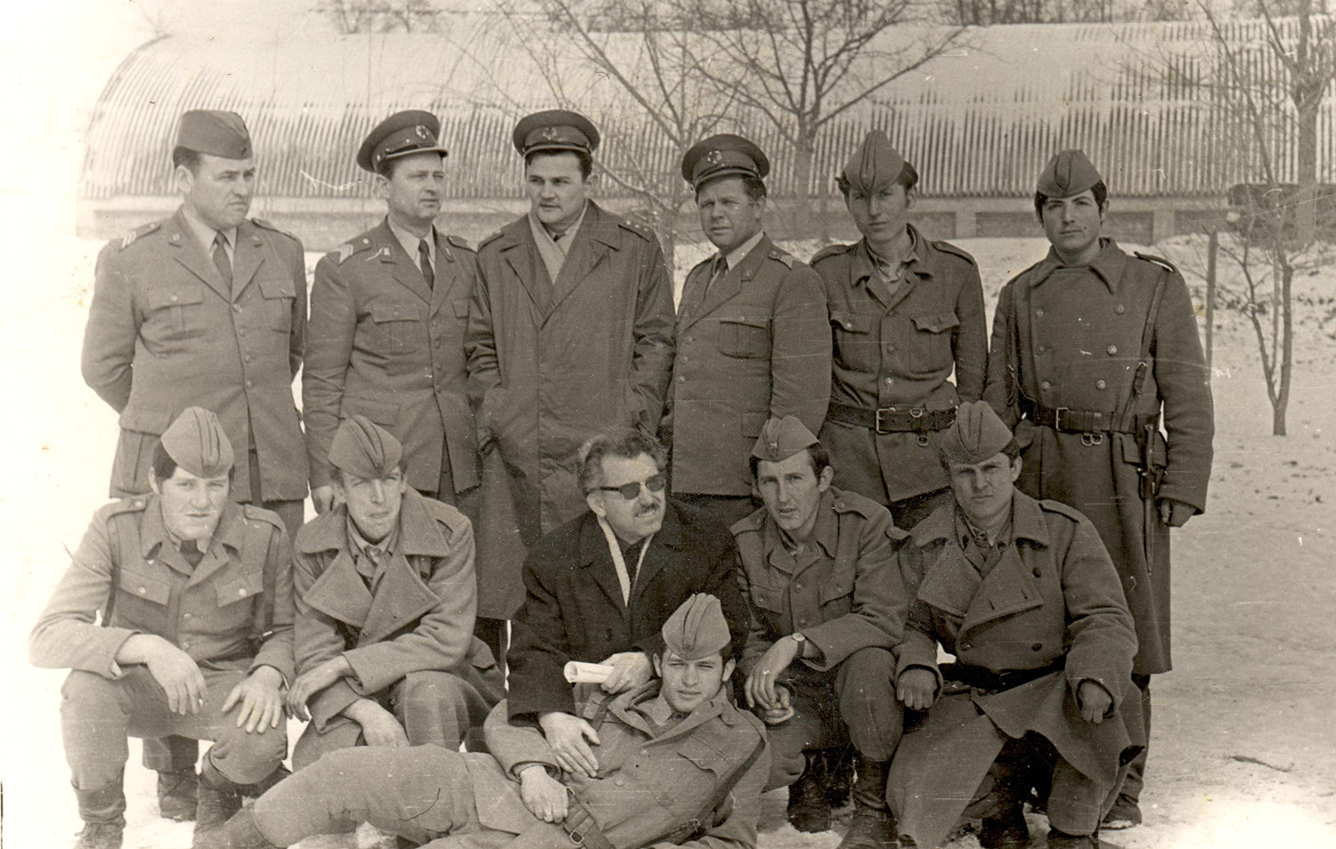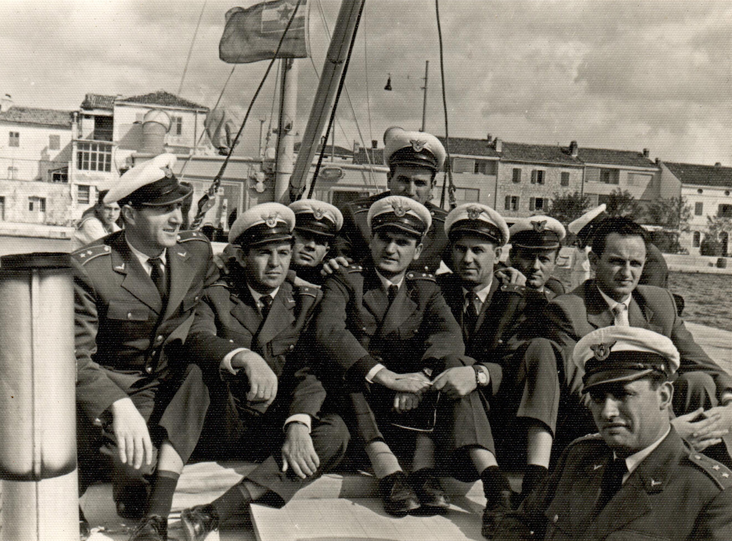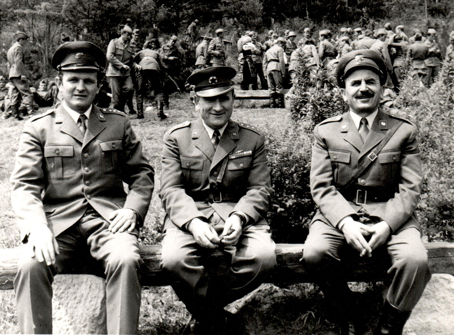 Снимок наглядно демонстрирует особенности ношения формы одежды в Югославской народной армии. В то время как рядовым эмблемы родов войск и службы не полагались ни при какой форме одежды, действующие офицеры и подофицеры (младшие офицеры) носили их на кителях служебной униформы. Б/м, б/д. Частная коллекция