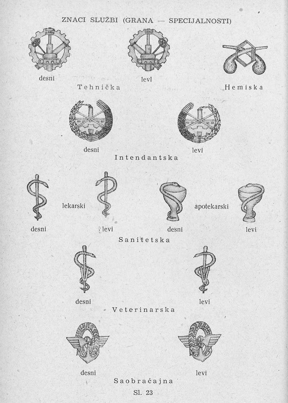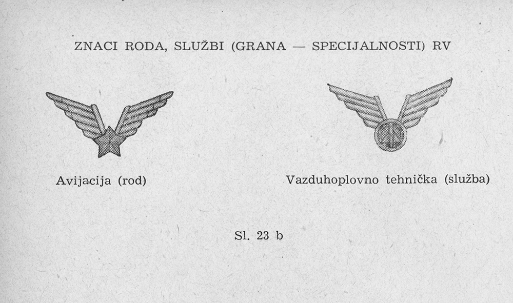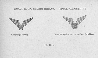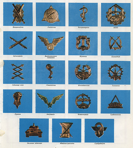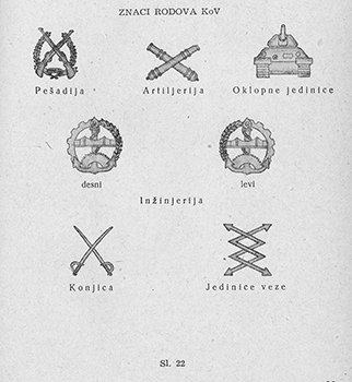 Рисунки эмблем родов войск, служб и специальностей ЮНА. Pravilo o odeći Jugoslovenske narodne armije - [Beograd]: Državni sekretarijat za poslove narodne odbrane, 1955, s. 29-32