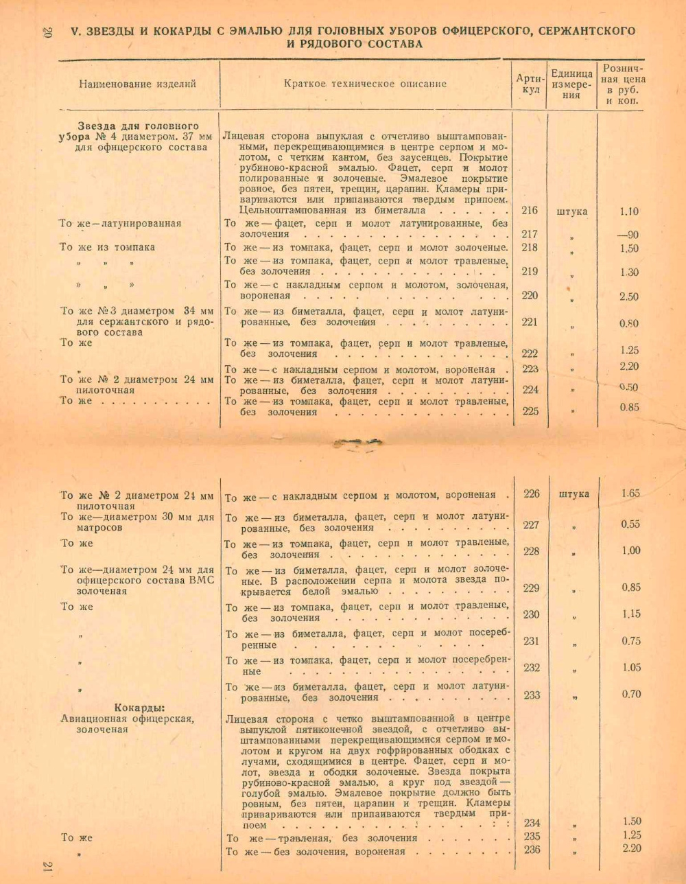 Косвенным подтверждением этой версии может выступить и «Прейскурант розничных цен на военные знаки различия производства предприятий государственной промышленности», выпущенный в 1947 году [12], один из разделов которого посвящен звездам и кокардам с эмалью для головных уборов офицерского, сержантского и рядового состава. В частности, там указаны звезды для головного убора № 4 диаметром 37 мм для офицерского состава из томпака, в описании которых указано: «Лицевая сторона выпуклая с отчетливо выштампованными, перекрещивающимися в центре серпом и молотом, с четким кантом, без заусенцев. Покрытие рубиново-красной эмалью. Фацет, серп и молот [...] золоченые [...]» или «[...] травленые, без золочения [...]». «[...] Эмалевое покрытие ровное, без пятен, трещин, царапин. Кламеры привариваются или припаиваются твердым припоем». Что полностью совпадает с рассматриваемыми звездами.