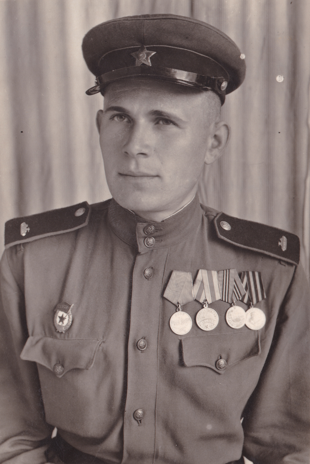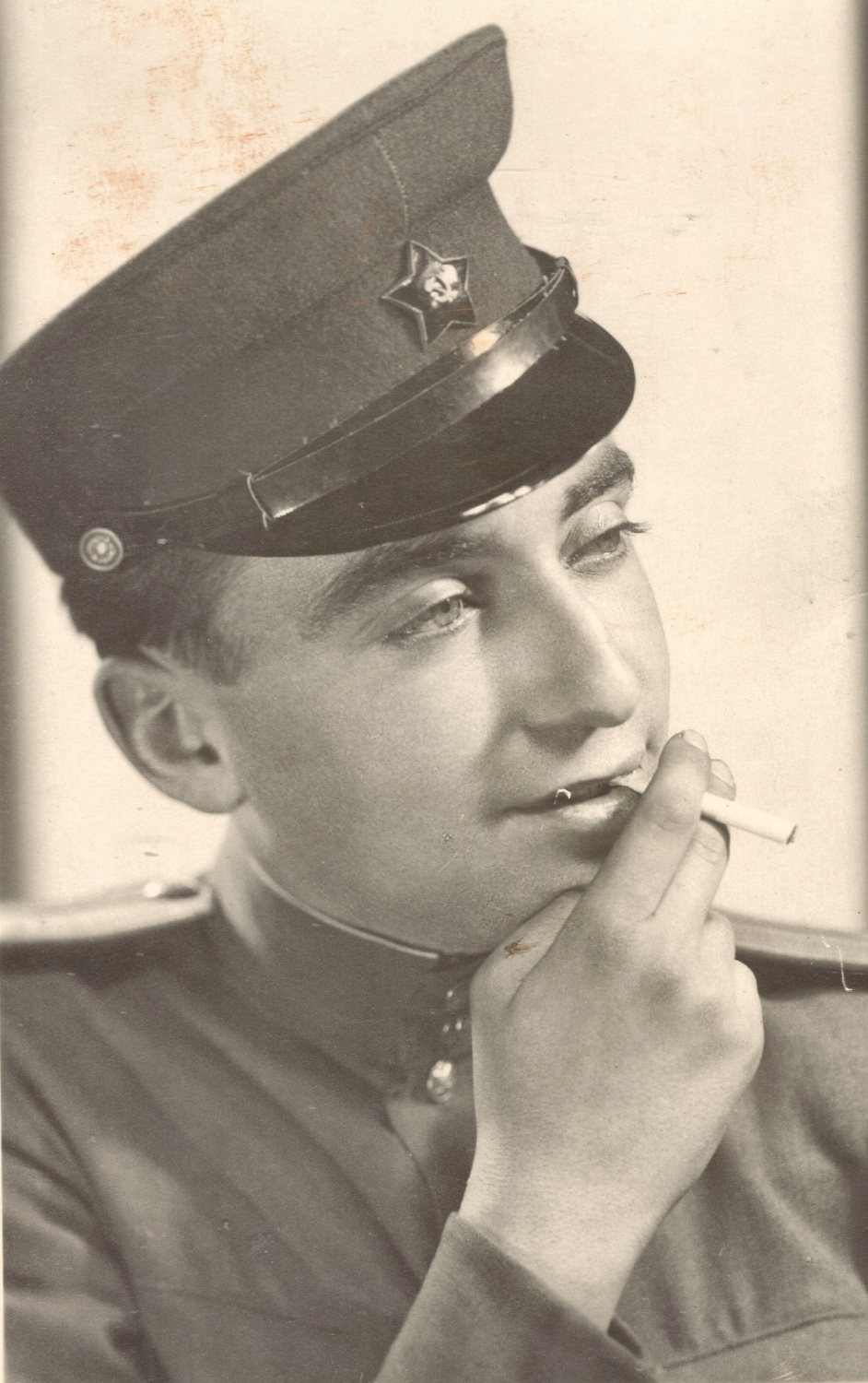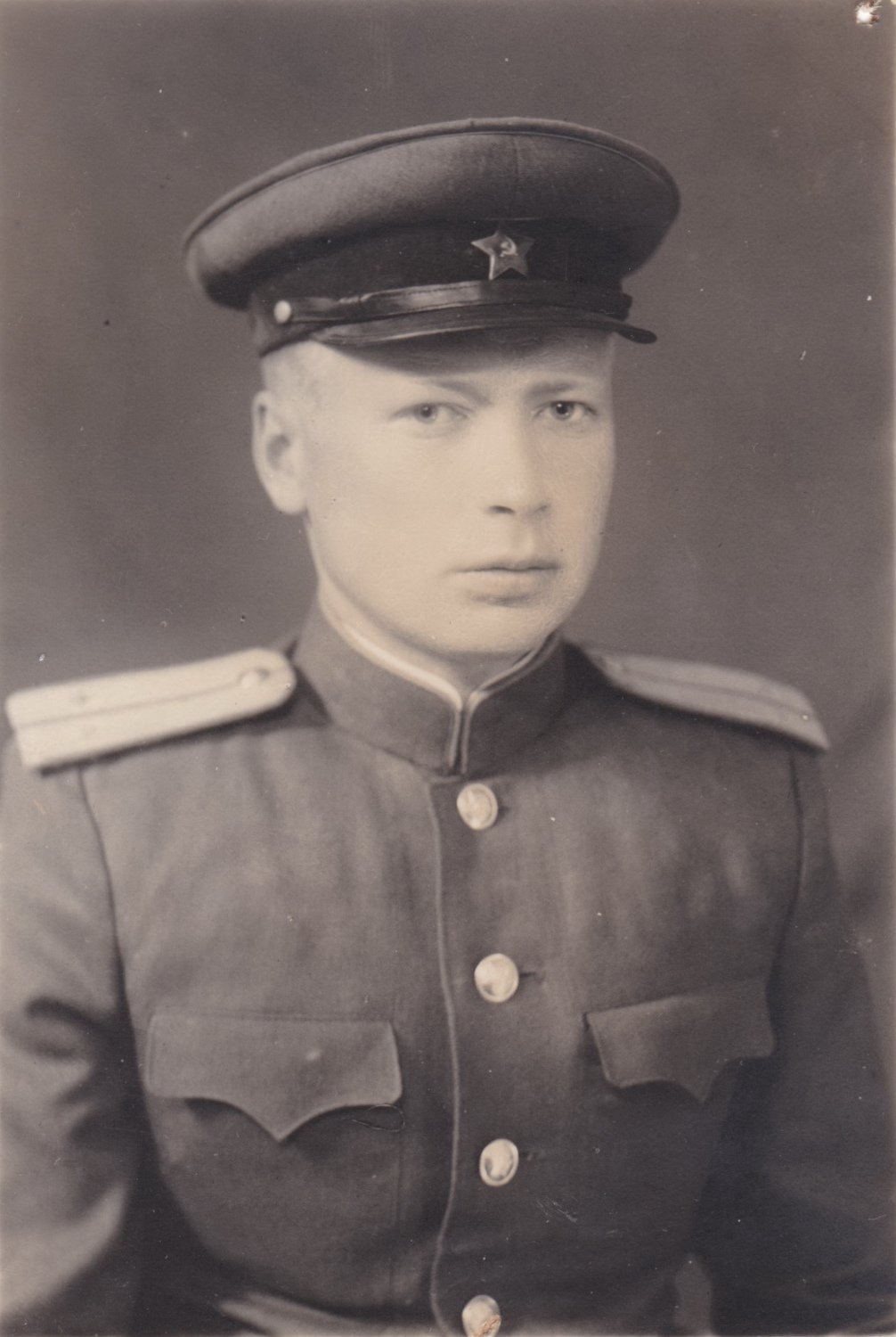 Неизвестный младший лейтенант. На фуражке немагнитная звезда описываемого образца. После 1945 г. Коллекция автора