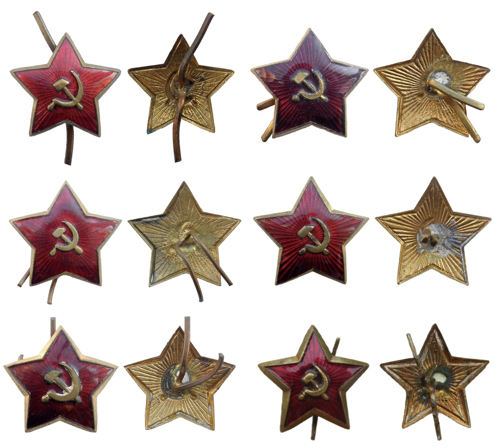 На данный момент все еще остается большое количество звезд, по которым, в силу отсутствия прямых документальных подтверждений, коллекционеры испытывают затруднения в датировке. Одними из них являются звезды, которые в среде коллекционеров условно принято датировать концом 20-х - началом 30-х годов. Внешне эти звезды могут иметь совершенно различные изображения серпа и молота, а также рисунок расходящихся из центра лучей, кламеры могут быть как проволочные, так и из полосок металла, заостренные или с прямым срезом. Размер по лучам может варьироваться в диапазоне от 32 до 39 мм, причем он очень часто бывает различен при измерении по разным диагоналям, также может различаться и их изгиб. Но у всех этих звездочек есть и схожие черты, которые позволяют объединить их в одну группу. Во-первых, это покрытие прозрачной горячей эмалью очень чистого рубинового цвета (в силу своей прозрачности и хрупкости в среде коллекционеров ее принято называть «стеклянной»). Во-вторых, в большинстве они очень «толстые» и тяжелые по сравнению со штампованными магнитными звездами. До нашего времени дошло большое количество подобных звезд в отличном состоянии, и они не являются особо редкими. Эти звезды очень часто можно увидеть установленными на головных уборах в экспозициях крупных антикварных магазинов, на аукционах, в музеях и т.д. Попробуем обсудить правильность их датировки.