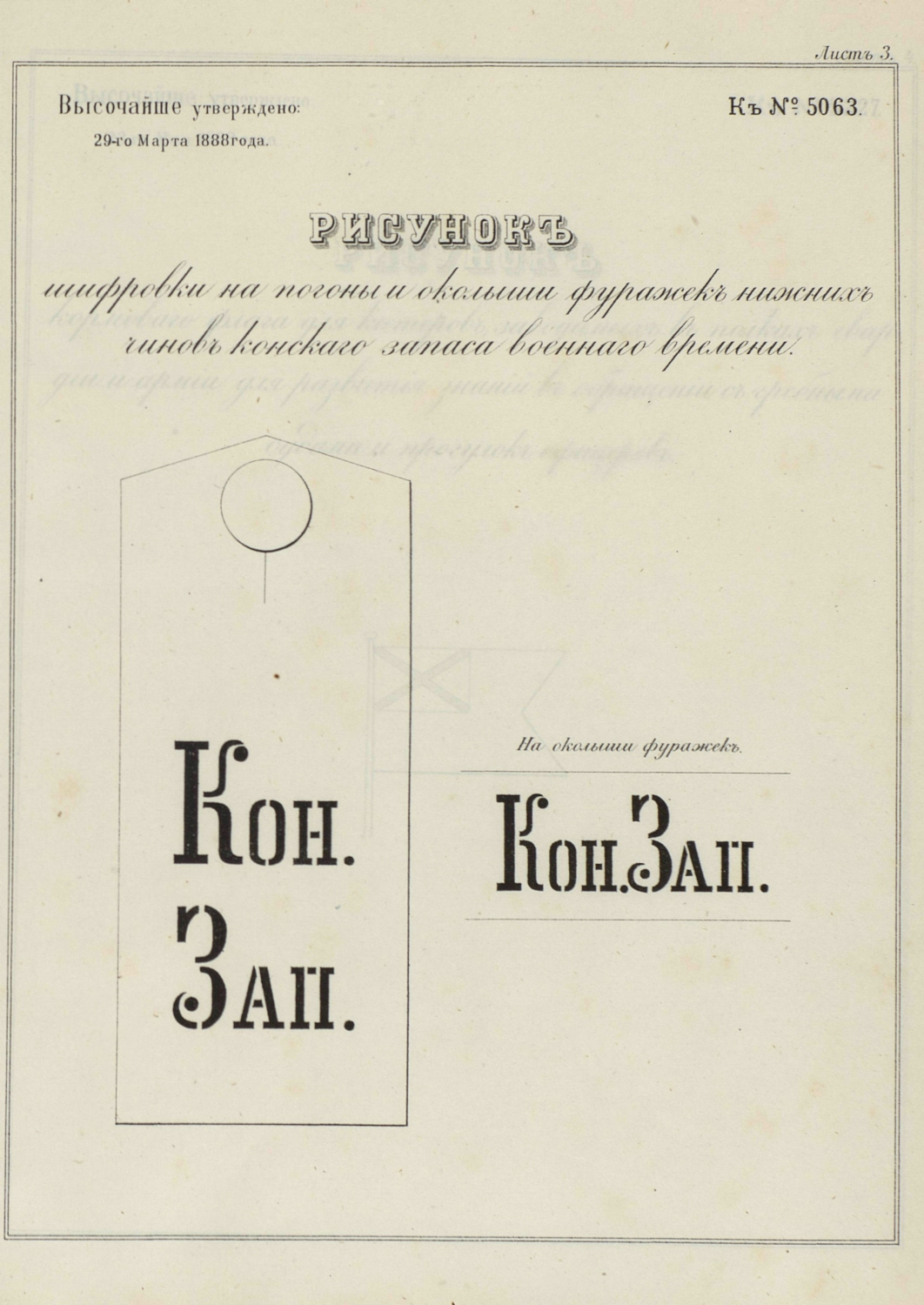 В 1914 г. ПВВ от 31 августа № 575 среди прочих, были объявлены новые шифровки для отделений конского запаса вида «к.з./№», причем вместо номеров или одновременно с ними могли использоваться литеры «где таковые положены» (Рисунок 2, 3). Несмотря на это, в период Первой мировой войны (далее – ПМВ) активно продолжали использоваться шифровки образца 1888 г., что подтверждается как наличием аутентичных погонов, так и фотографий с данными шифровками (Рисунок 4–6).
