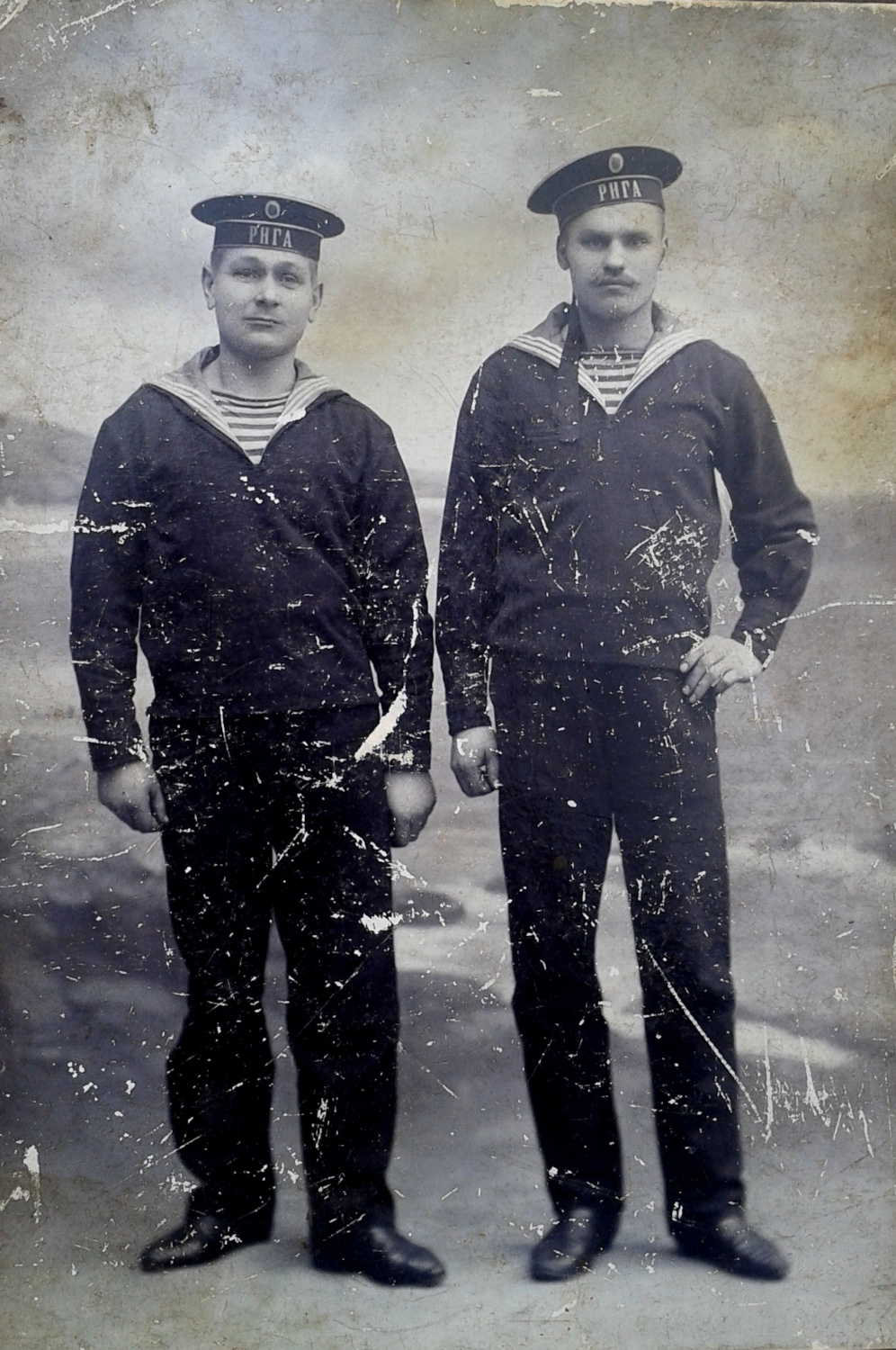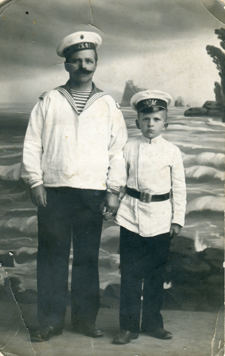 Учащийся Ревельской гимназии императора Николая I в летней куртке произвольного образца (справа) с отцом (?), унтер-офицером Ревельского флотского полуэкипажа (слева). 4 сентября 1915 г. Коллекция Кирилла Сологуба