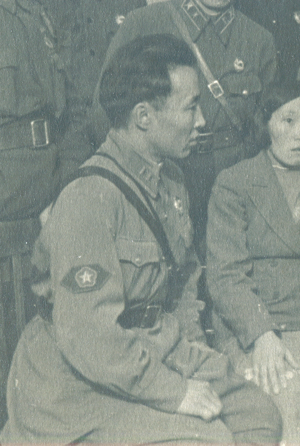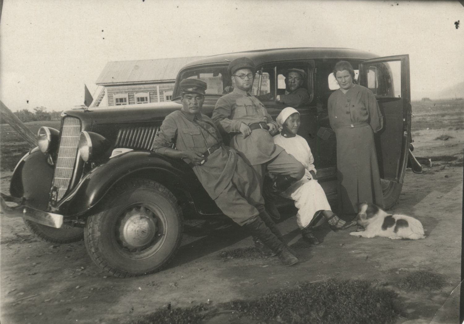 Военнослужащий Тувинской народно-революционной армии со знаками различия в виде петлиц треугольной формы рядом с автомобилем советского полпредства в Туве. Коллекция Евгения Дрига
