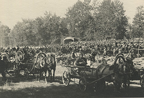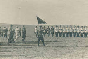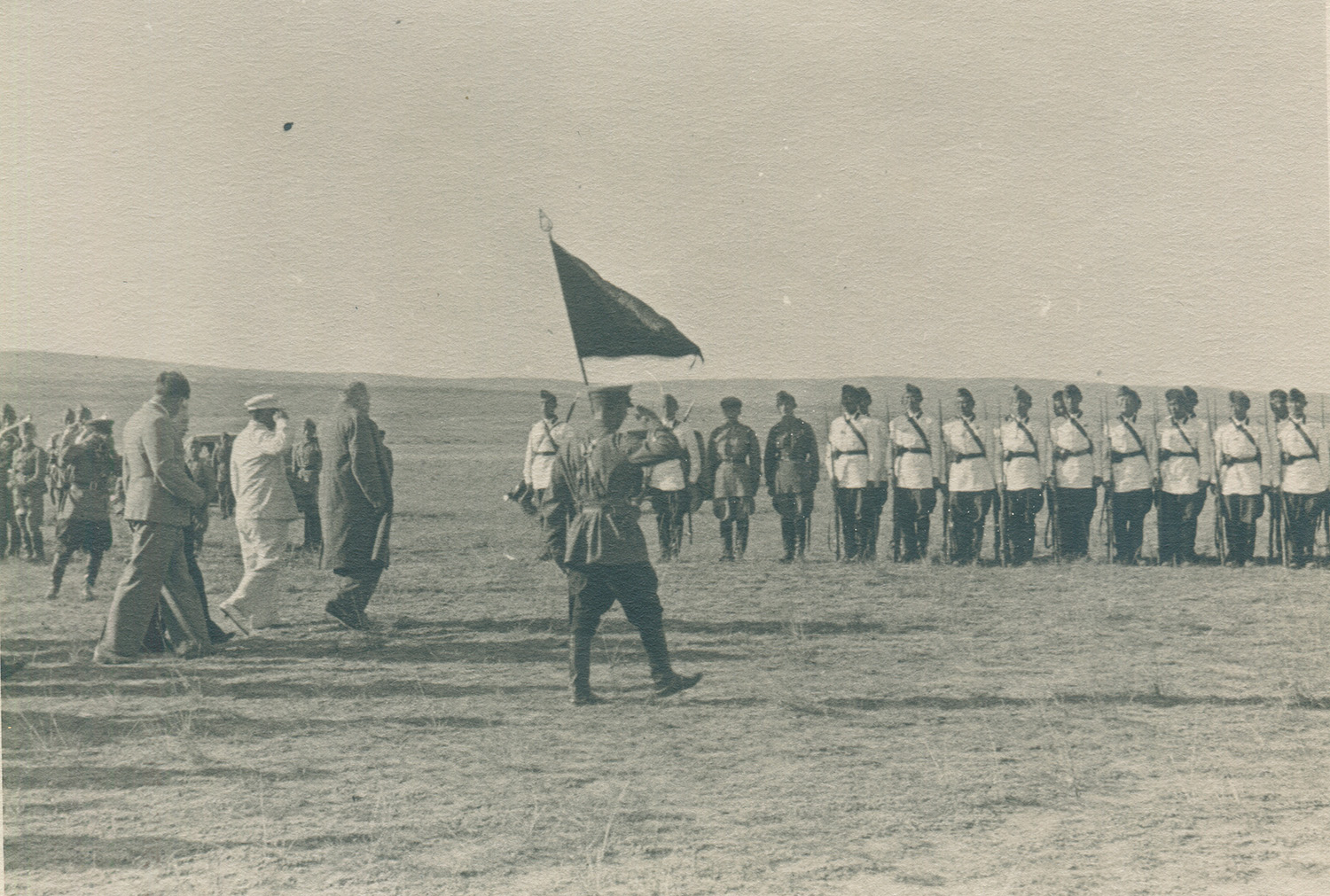 Торжественное мероприятие в ТАР, посвященное сбору подарков для Красной армии. На заднем плане выстроен кавалерийский полк, представлявший собой практически все вооруженные силы Тувы. 1943 г.(?). Коллекция Евгения Дрига