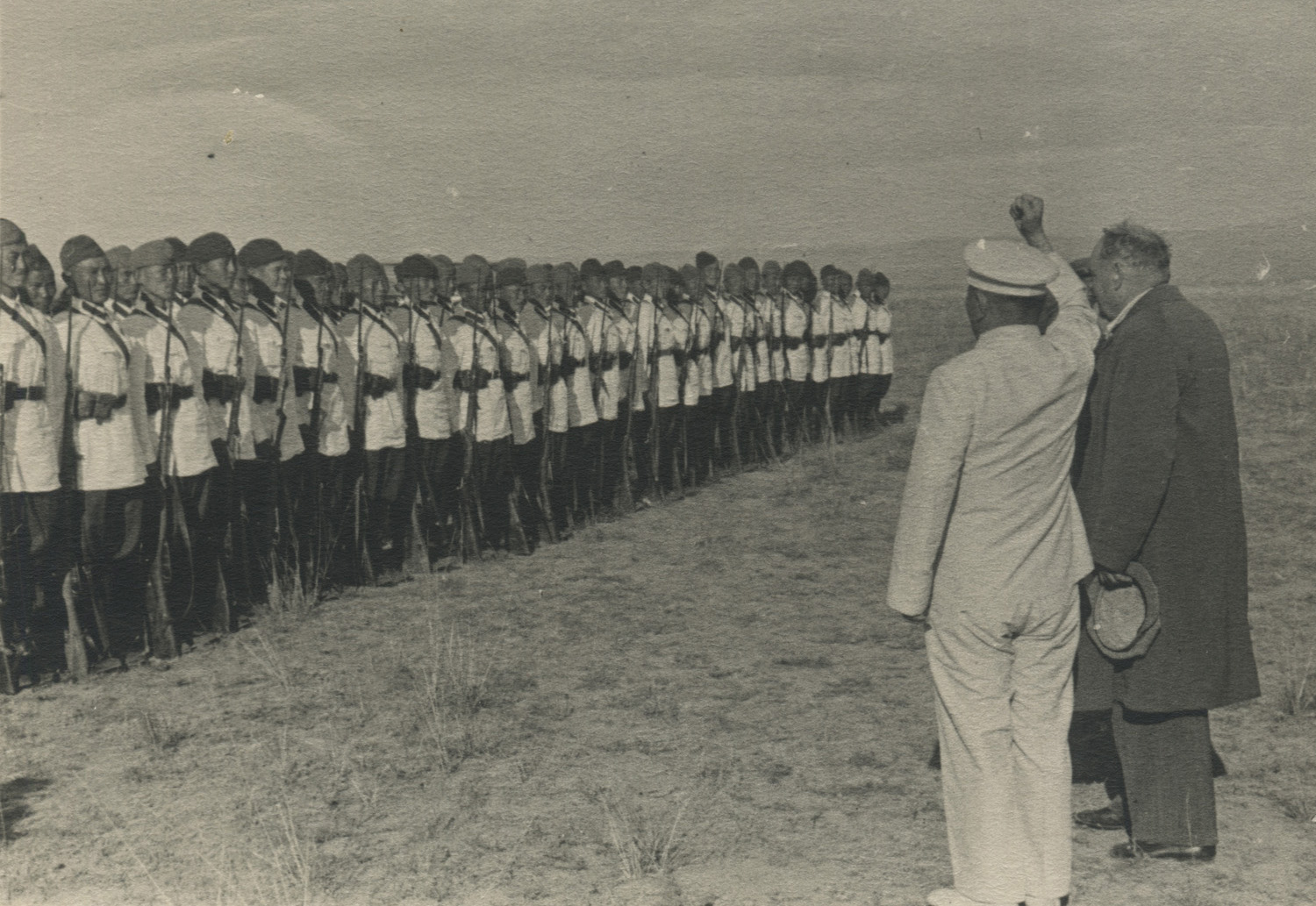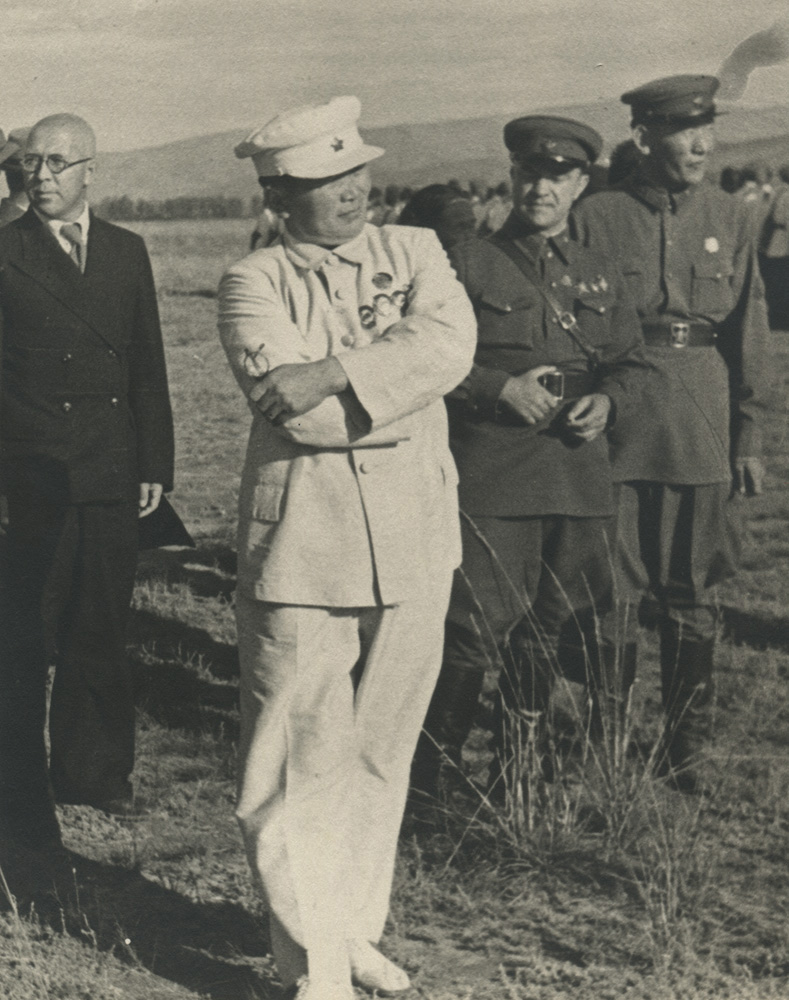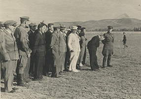 Встреча председателя Президиума Верховного Совета РСФСР А.Е. Бадаева на аэродроме. В белом френче и фуражке - первый секретарь ЦК ТНРП Салчак Тока, крайний слева в открытом френче - министр внутренних дел ТНР Сат Товариштай. ТАР, лето 1943 г. Коллекция Евгения Дрига (фото опубликовано в статье: Борис Монгуш. Знаки различия военнослужащих Тувинской народно-революционной армии и сотрудников МВД ТНР. 1932–1941 // Старый Цейхгауз, № 4 (72), 2016)