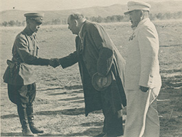 Председатель Верховного Совета РСФСР А.Е. Бадаев здоровается с командиром роты МВД ТАР. Справа -первый секретарь ЦК ТНРП Салчак Тока. ТАР, 1943 г. Коллекция Евгения Дрига
