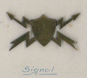 У утвержденной эмблемы войск связи изображение щита стало с каймой без шраффировки, что в геральдике означает серебро (белый цвет), и центральным полем с вертикальной шраффировкой, которая обозначает червлень (красный цвет). Флажки, использовавшиеся в визуальной сигнализации в дневное время, как раз состоят из этих двух цветов.